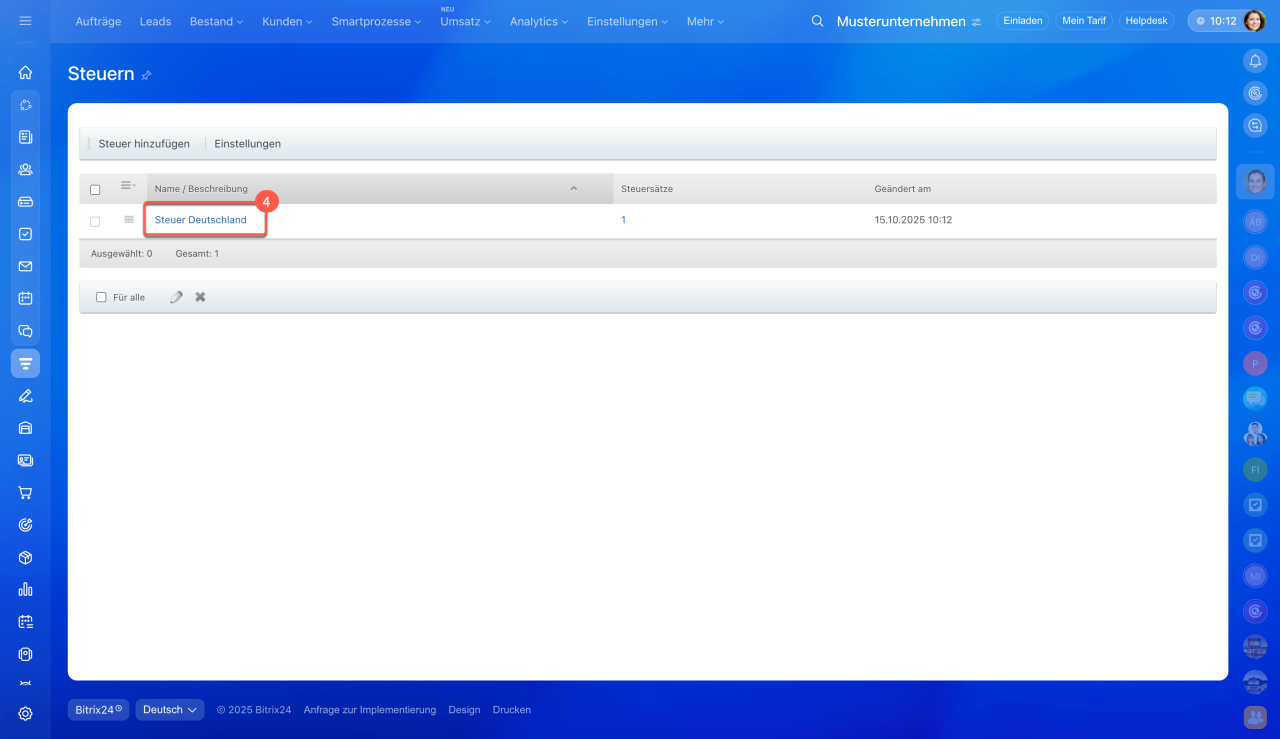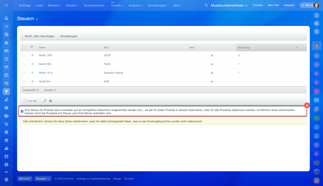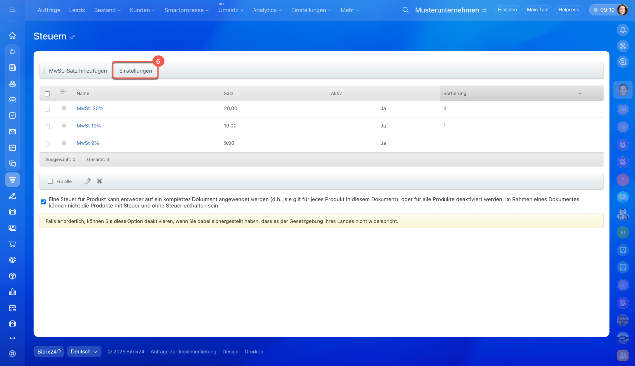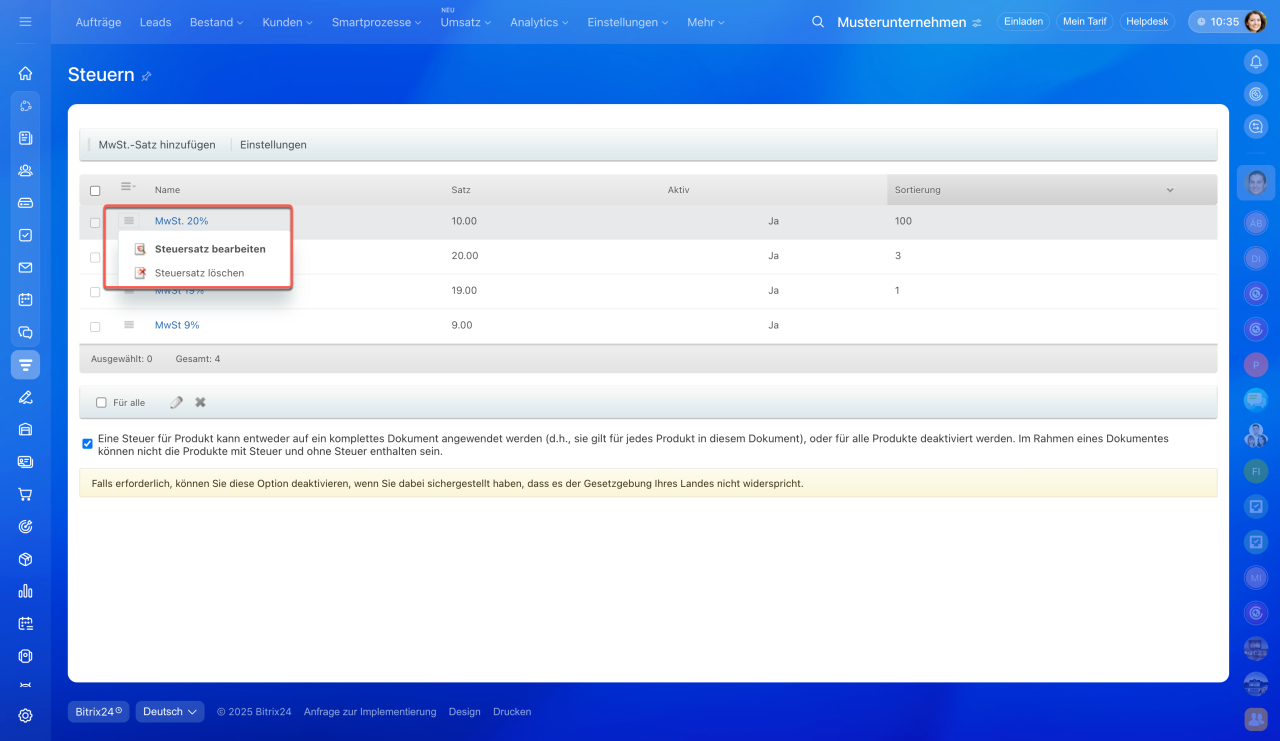 - In Bitrix24 können Sie Steuersätze für Produkte und Dienstleistungen einrichten. Dadurch entfällt die manuelle Berechnung – die Steuer wird automatisch in Dokumente, Rechnungen und Aufträge übernommen.