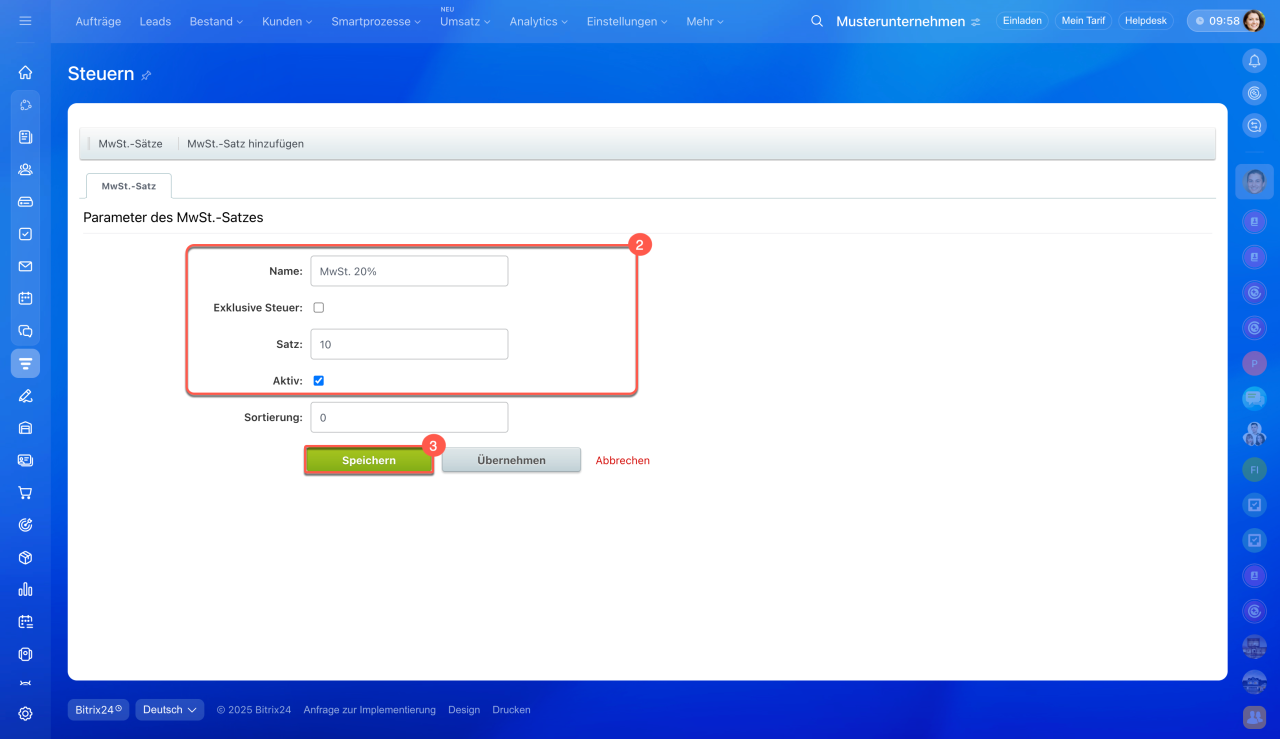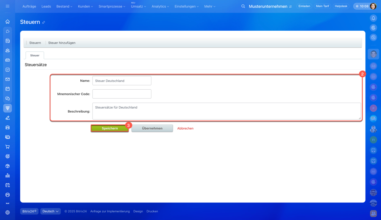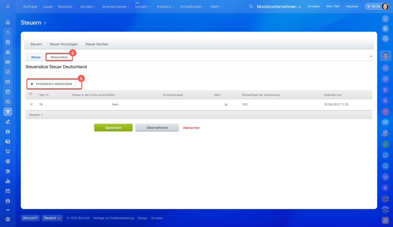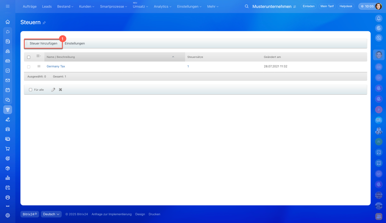 - In Bitrix24 können Sie Steuersätze für Produkte und Dienstleistungen einrichten. Dadurch entfällt die manuelle Berechnung – die Steuer wird automatisch in Dokumente, Rechnungen und Aufträge übernommen.