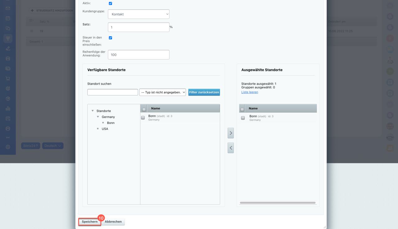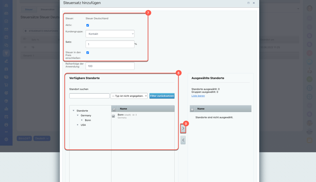 - Nur Bitrix24-Administratoren und Mitarbeiter mit der Berechtigung Nutzer kann CRM-Einstellungen bearbeiten können Steuersätze hinzufügen und bearbeiten.