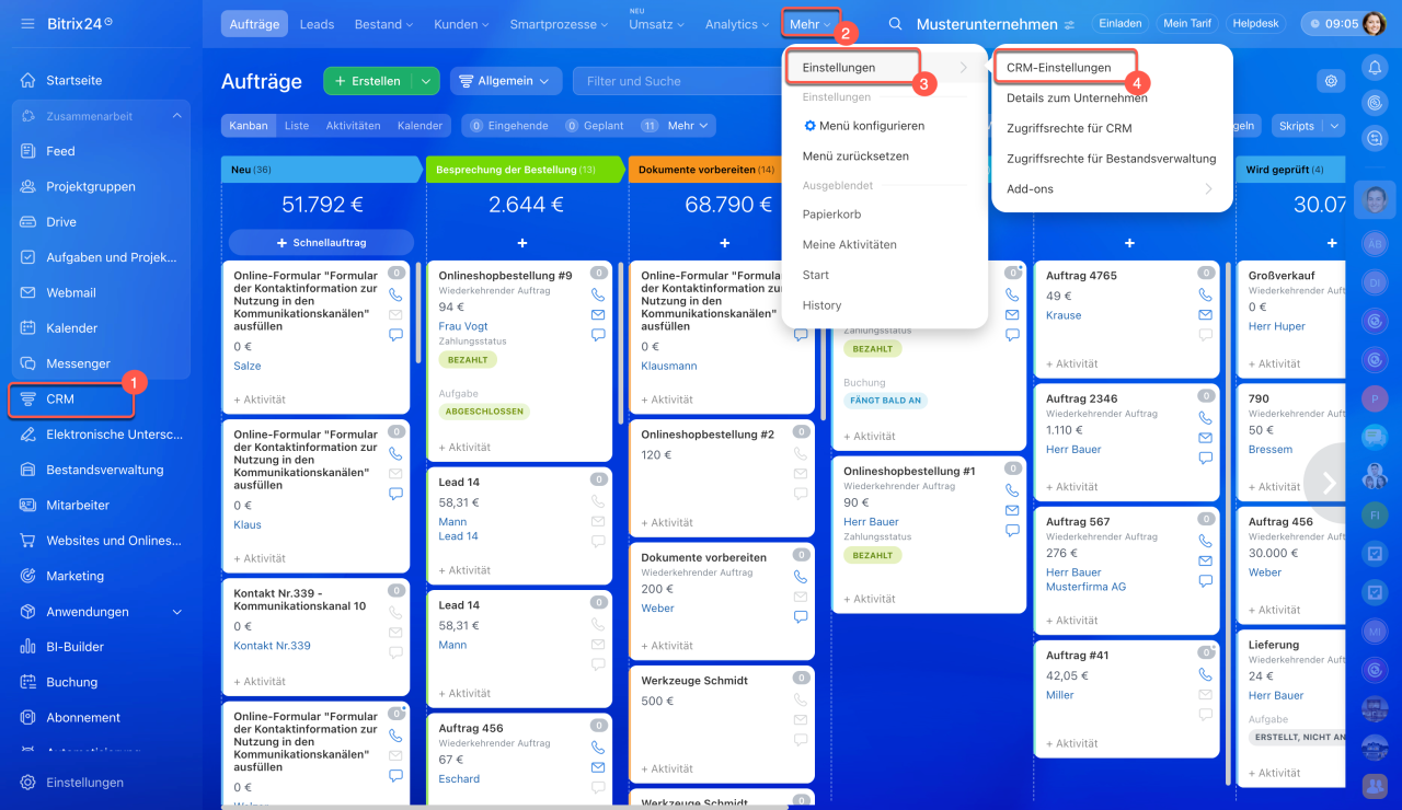 In Bitrix24 können Sie Steuersätze für Produkte und Dienstleistungen einrichten. Dadurch entfällt die manuelle Berechnung – die Steuer wird automatisch in Dokumente, Rechnungen und Aufträge übernommen. Der Kunde sieht sofort den Gesamtbetrag inklusive Mehrwertsteuer, und Mitarbeiter vermeiden Fehler bei der Abrechnung.