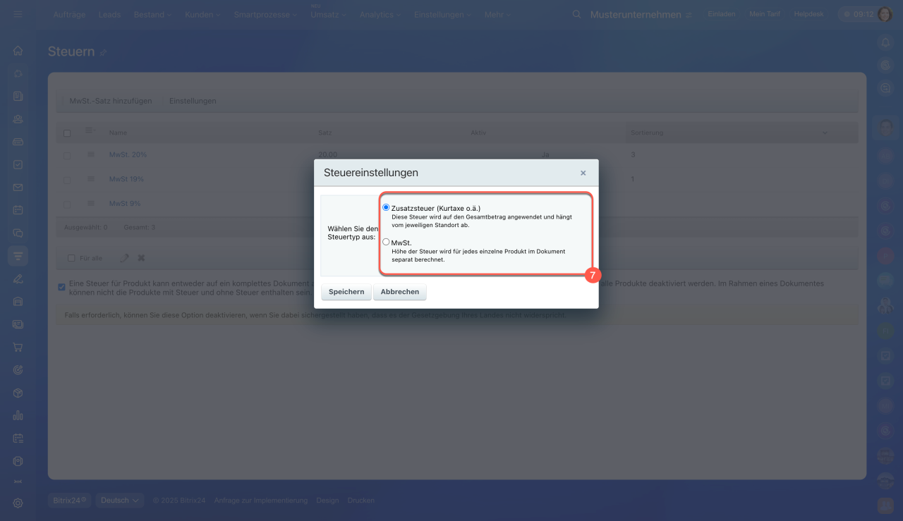 Im CRM stehen 2 Steuerarten zur Verfügung: für den Gesamtbetrag sowie für einzelne Produkte. Sie können die Steuerart auswählen, bestehende Sätze anpassen oder neue hinzufügen.