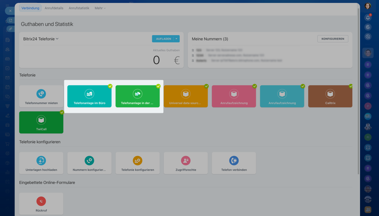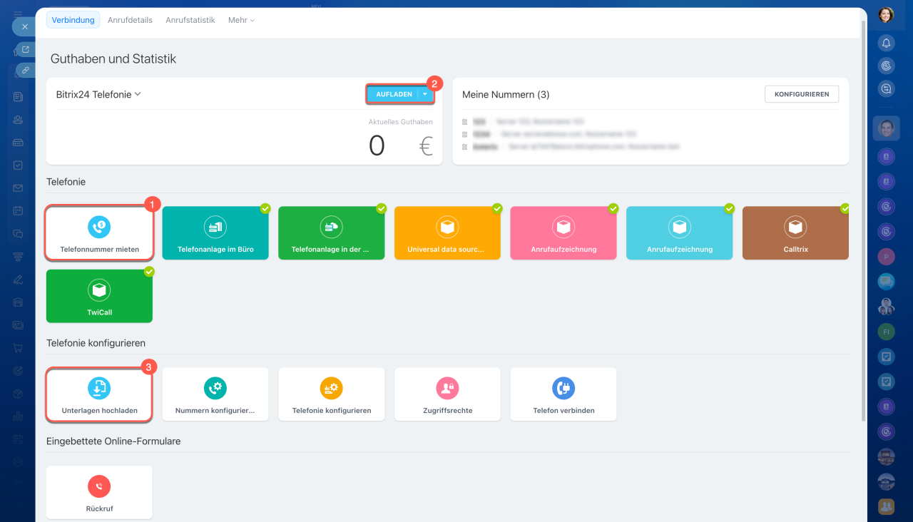 Ihr Telefonie-Anbieter berechnet die Gebühren für ausgehende und eingehende Anrufe. In diesem Fall ist keine Aufladung des Telefonie-Guthabens in Bitrix24 erforderlich.