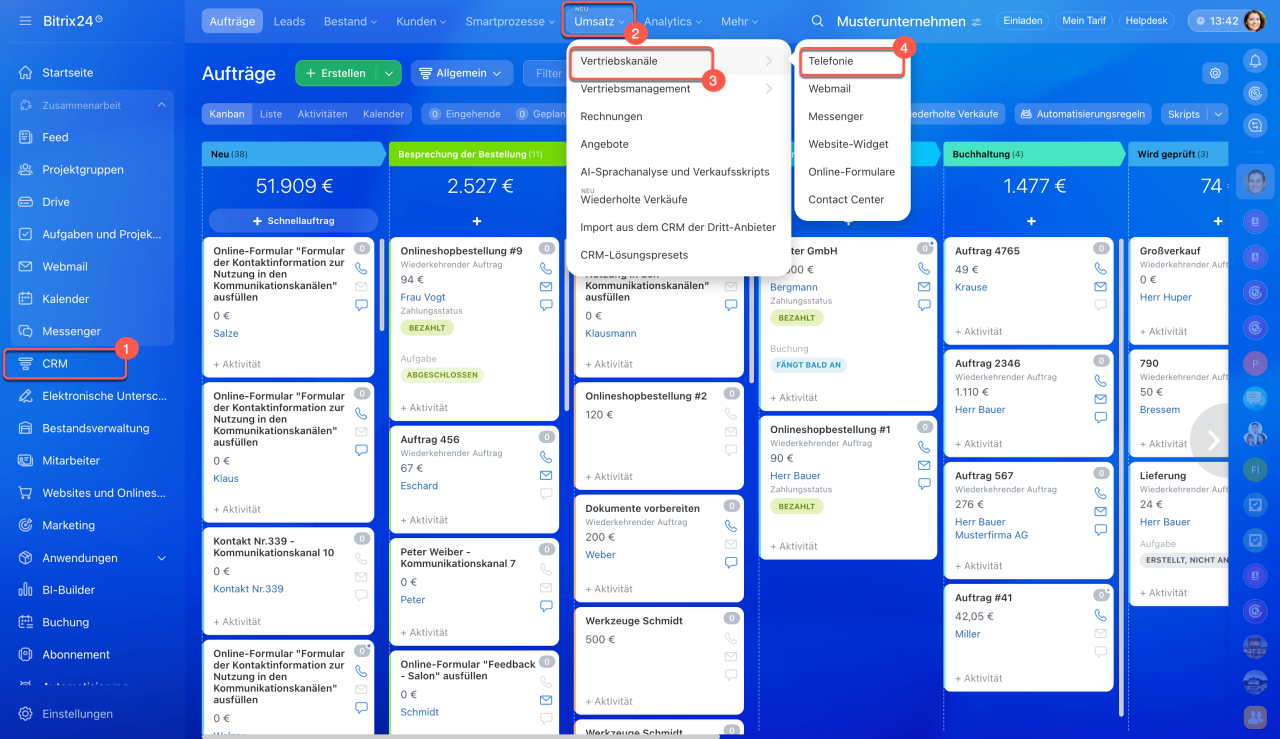 - Öffnen Sie den Bereich CRM > Umsatz > Vertriebskanäle > Telefonie.