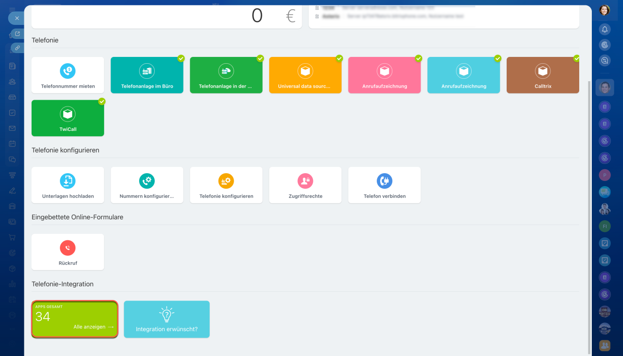 - Scrollen Sie bis zum Bereich Telefonie-Integration und klicken Sie auf das Feld Apps gesamt.