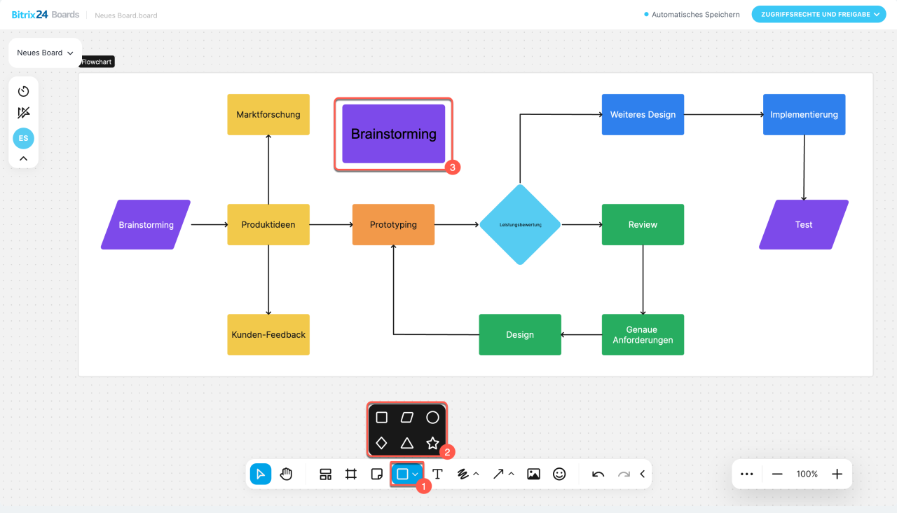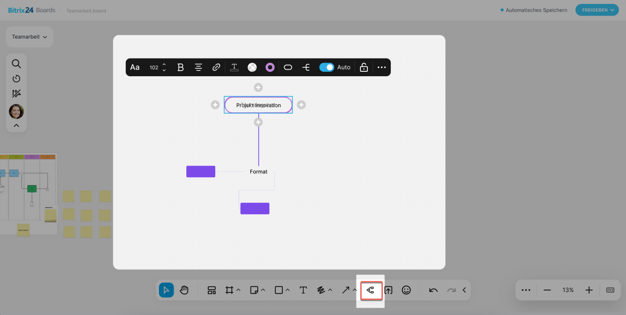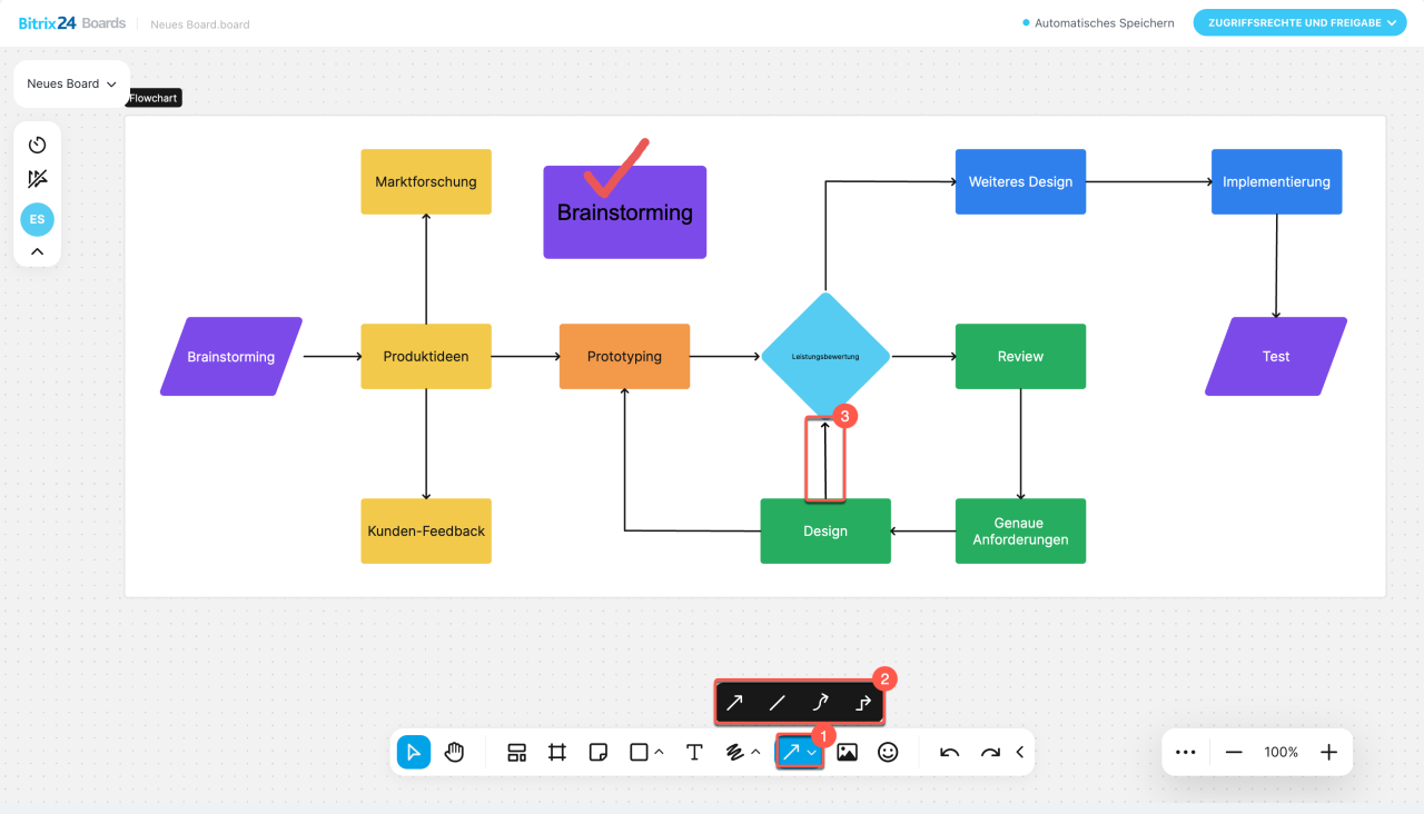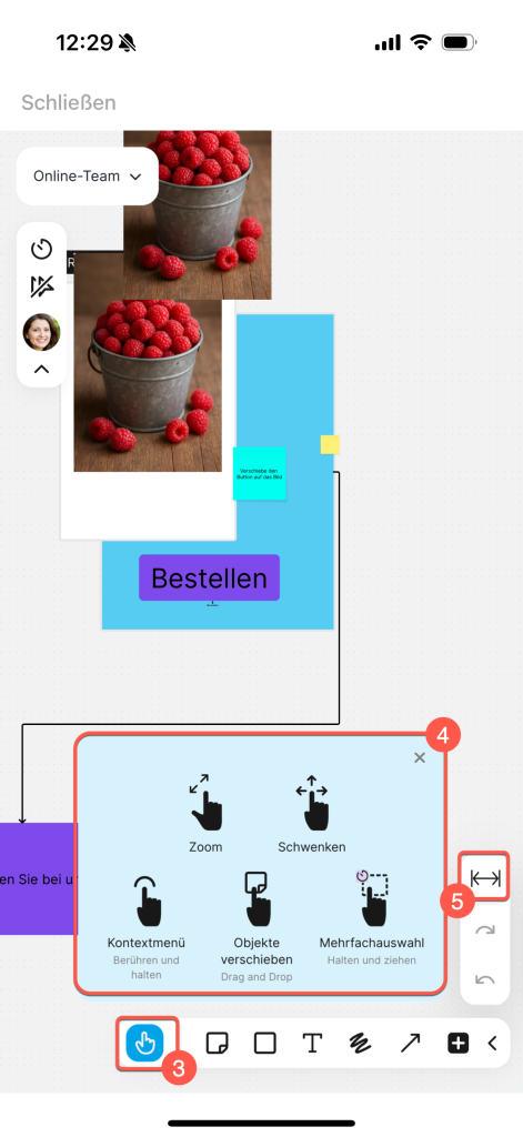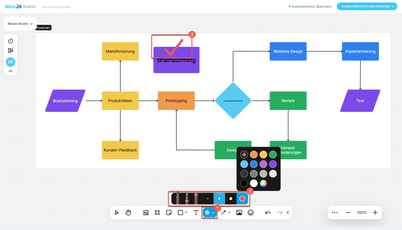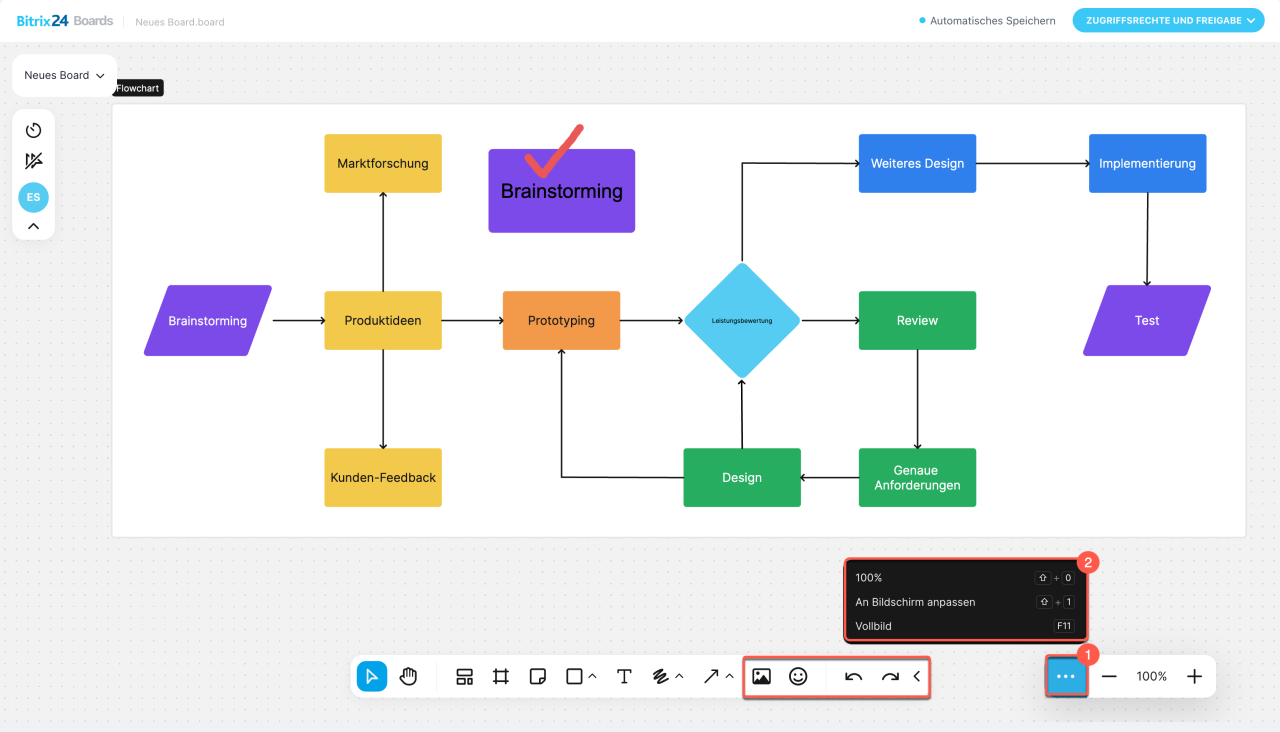 In der Werkzeugleiste unten stehen Ihnen verschiedene Werkzeuge zur Bearbeitung des Boards zur Verfügung. Damit können Sie Flussdiagramme erstellen, zeichnen, Texte einfügen, Elemente ausrichten, wichtige Details hervorheben und vieles mehr.