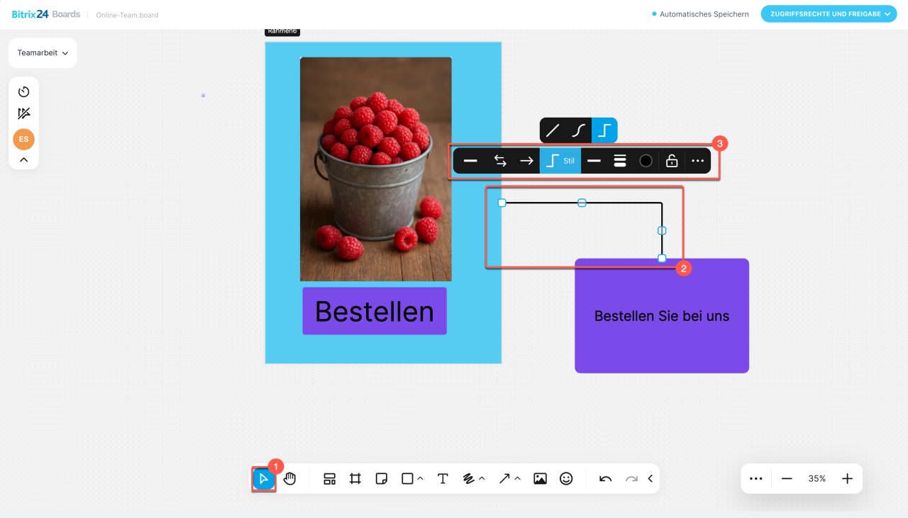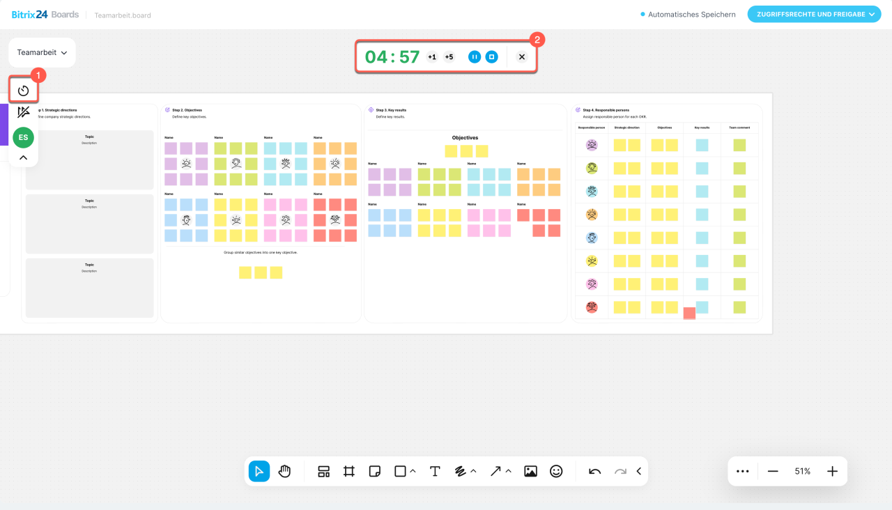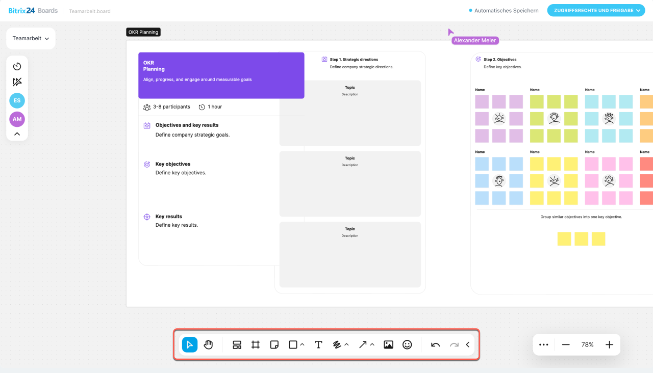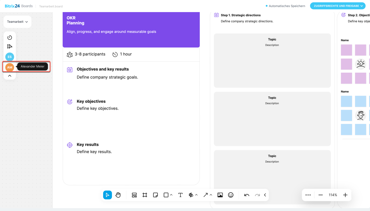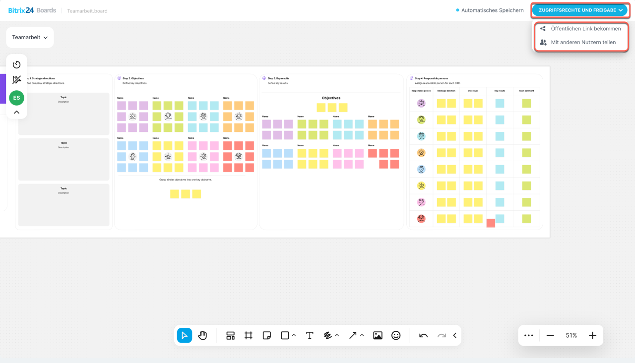 - Alle Änderungen werden automatisch gespeichert: Die Teilnehmer sehen Aktualisierungen in Echtzeit und können direkt auf dem Board Kommentare hinterlassen.