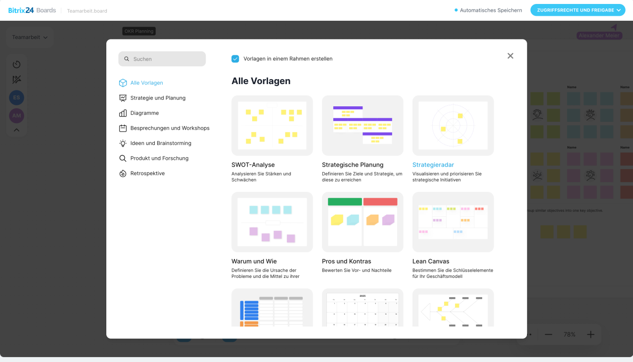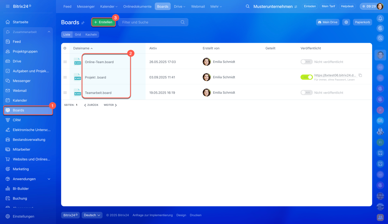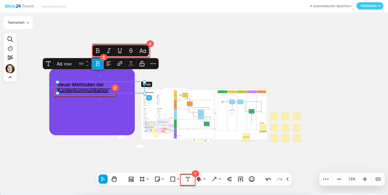 Bitrix24-Boards bieten den perfekten Raum für Teamarbeit. Auf einem Board können Teams Ideen sammeln, Layouts diskutieren, Präsentationen planen und Prozesse visualisieren – ohne externe Dienste verwenden zu müssen.