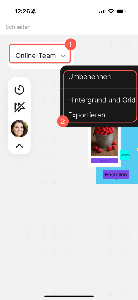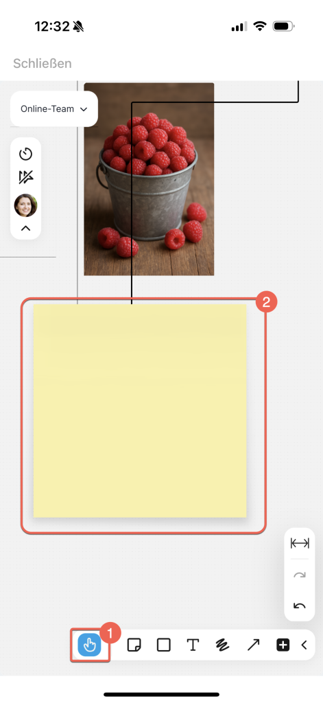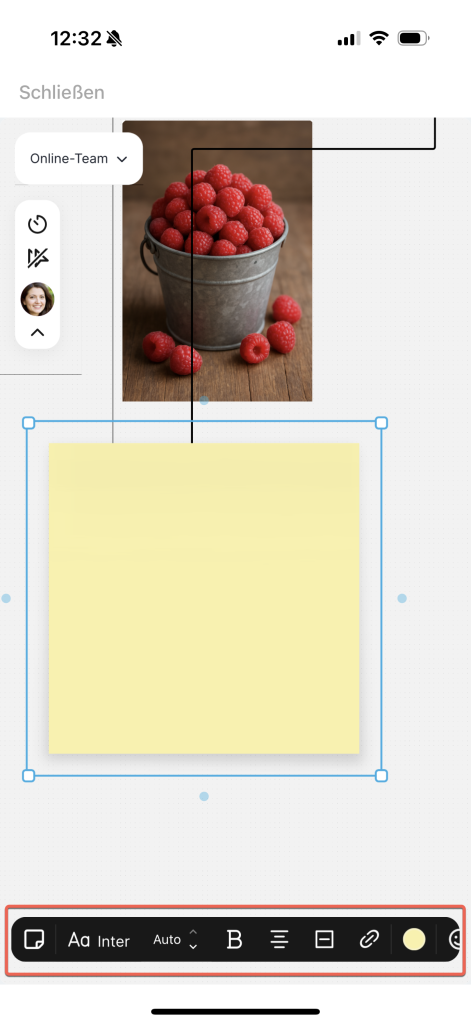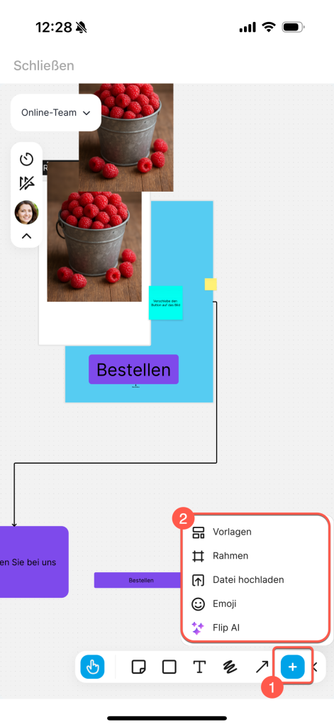 In der mobilen App können Sie das Board genauso bearbeiten wie am Computer: Diagramme erstellen, Überschriften, Emojis und Aufkleber hinzufügen und vieles mehr. Die Werkzeugleiste befindet sich unten auf dem Bildschirm – tippen Sie auf ➕, um sie zu öffnen.