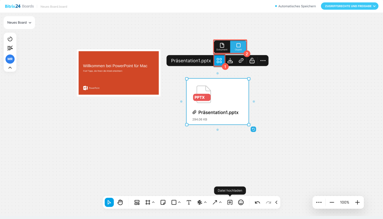 - Dokument — ermöglicht das Durchblättern der Seiten direkt auf der Tafel, ohne die Datei herunterzuladen.