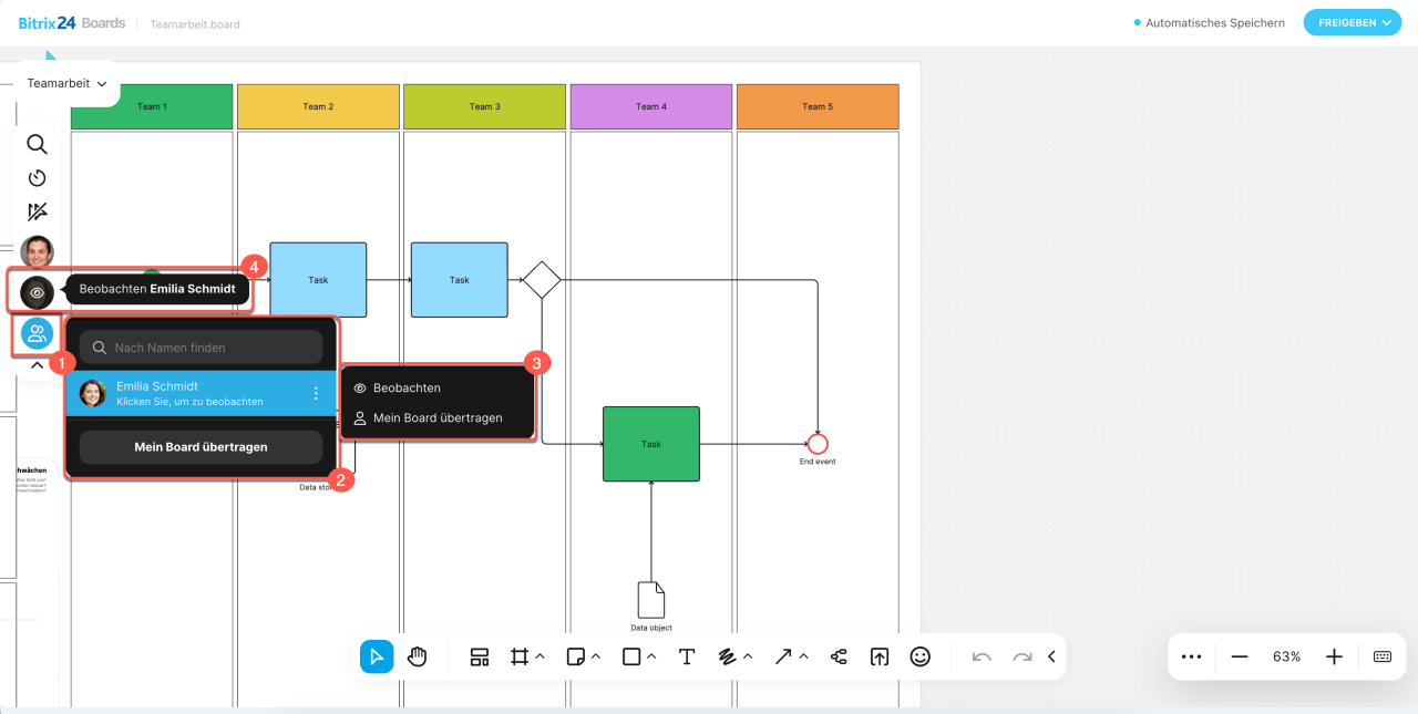 - Beobachten – verschiebt das Board auf Ihrem Bildschirm automatisch zu dem Bereich, an dem der Nutzer arbeitet, und passt den Zoom an.