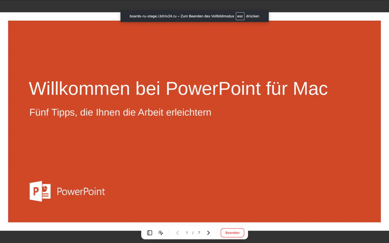 - Vollbildansicht aktivieren — das Dokument im Vollbildmodus anzeigen, Folien durchblättern, einen Zeiger verwenden.