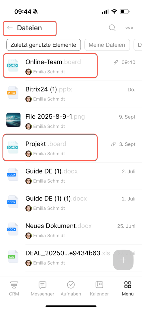 In der mobilen App stehen Ihnen alle Boards zur Verfügung, die bereits in Bitrix24 am Computer erstellt wurden. Dies kann Ihr eigenes Board oder ein Board sein, für das Sie Zugriffsrechte besitzen. Sie finden und öffnen ein Board in allen Elementen, mit denen es verknüpft ist: Aufgaben, Chats, Feeds usw. Alle für Sie verfügbaren Boards werden im Bereich Dateien gespeichert.
