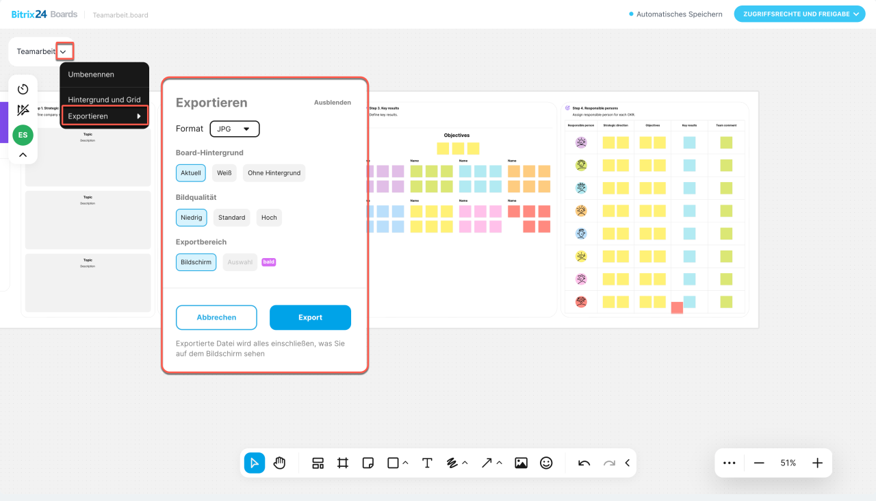 - Exportieren – laden Sie das Board auf Ihren Computer herunter. Wählen Sie den Hintergrund, den Bereich des Boards für den Export, das Dateiformat und die Auflösung der Datei.