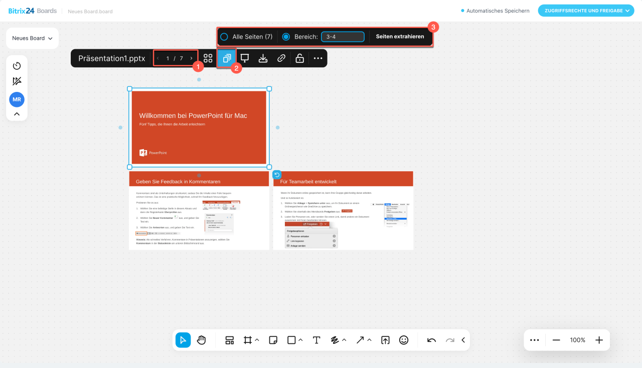 - Alle Seiten oder bestimmte Bereiche extrahieren — die ausgewählten Seiten werden als separate Dateien auf dem Board hinzugefügt,