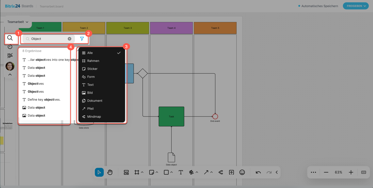 – hilft, auf dem Board nach den gewünschten Objekten anhand von Schlüsselwörtern und Elementtypen zu suchen.