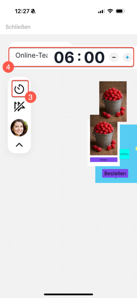 – hilft dem Team, den Zeitplan einzuhalten und sich auf die Inhalte des Boards zu konzentrieren, beispielsweise während einer Projektpräsentation oder einer Brainstorming-Sitzung. Der gestartete Timer ist für alle Teilnehmer sichtbar, die aktuell am Board arbeiten.