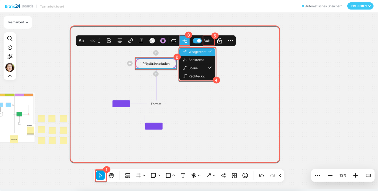 — Verbinden Sie Objekte auf der Tafel. Sie können verschiedene Pfeiltypen nutzen, um Beziehungen zwischen Elementen darzustellen oder eine Abfolge zu veranschaulichen.