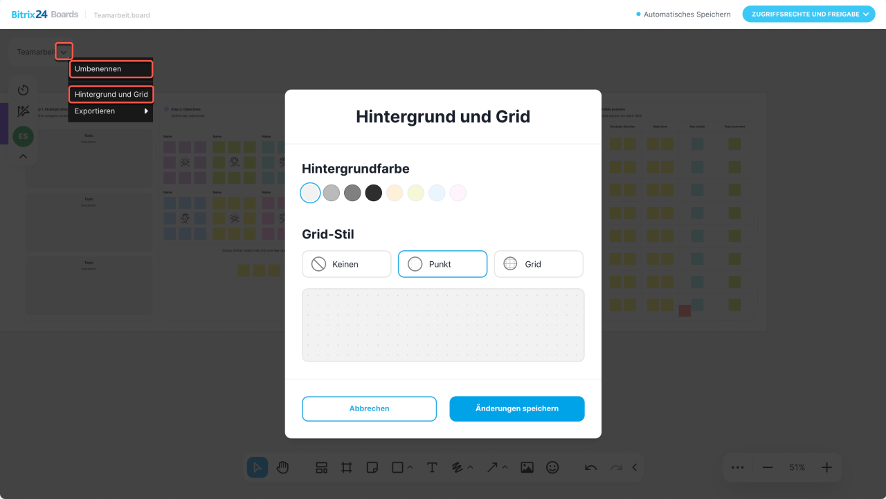 - Hintergrund und Grid – passen Sie das Design des Boards an. Wählen Sie die Hintergrundfarbe und den Grid-Stil: Punkte, Gitter oder entfernen Sie die Markierung.