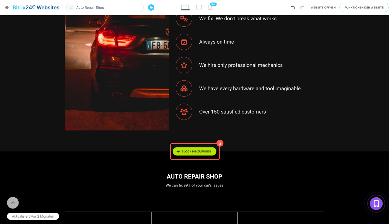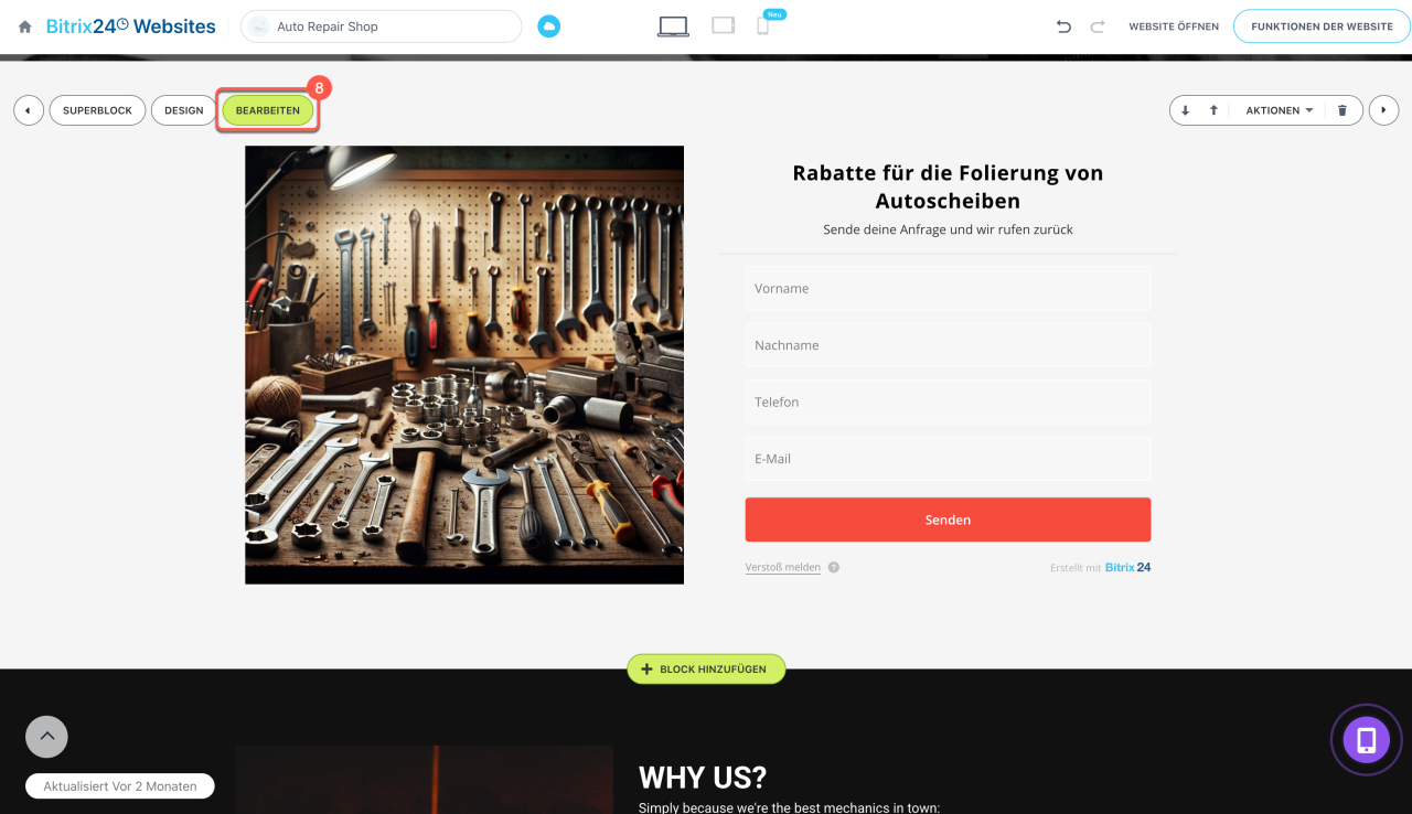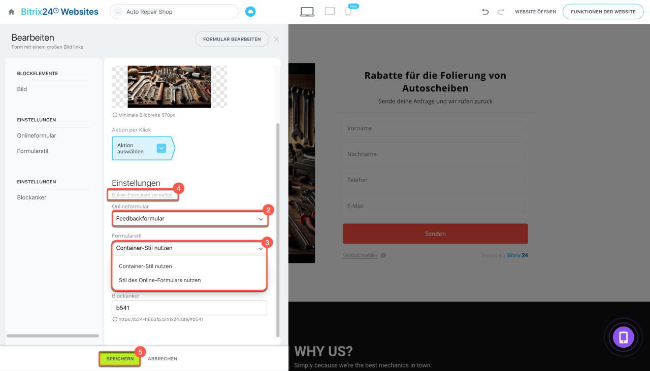 Block anpassen. Auf der Website wird ein Block mit einem der in Ihrem Bitrix24 erstellten Online-Formulare hinzugefügt, aber Sie können ein anderes auswählen: