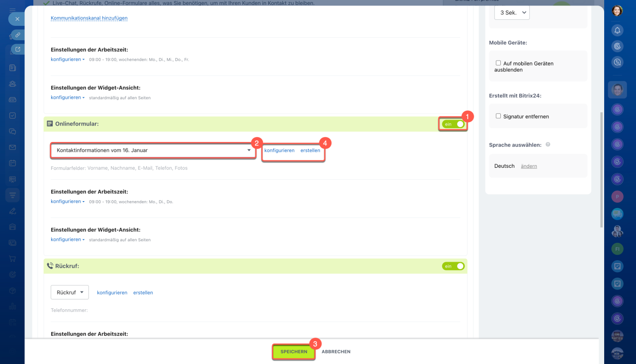 1–2. Aktivieren Sie den Kanal Online-Formular und wählen Sie das gewünschte Formular aus der Liste.