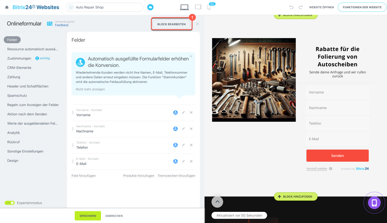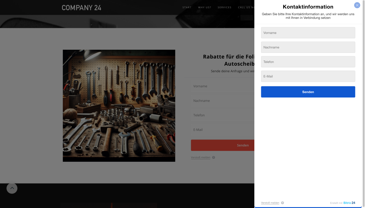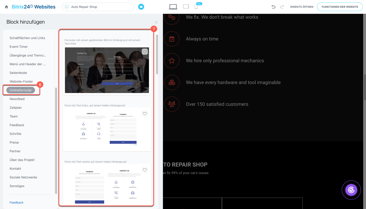• Online-Formulare helfen dabei, Anfragen, Kontakte und Kundenfeedback zu sammeln. Sie können auf der Website in einem separaten Block oder Widget platziert werden.