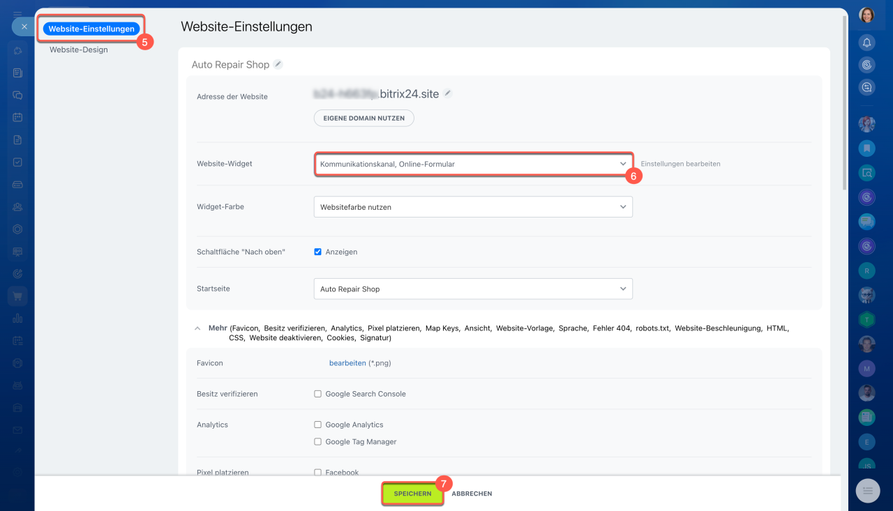 5–6. Wählen Sie im Bereich Website-Einstellungen das Widget mit dem Online-Formular aus der Liste.