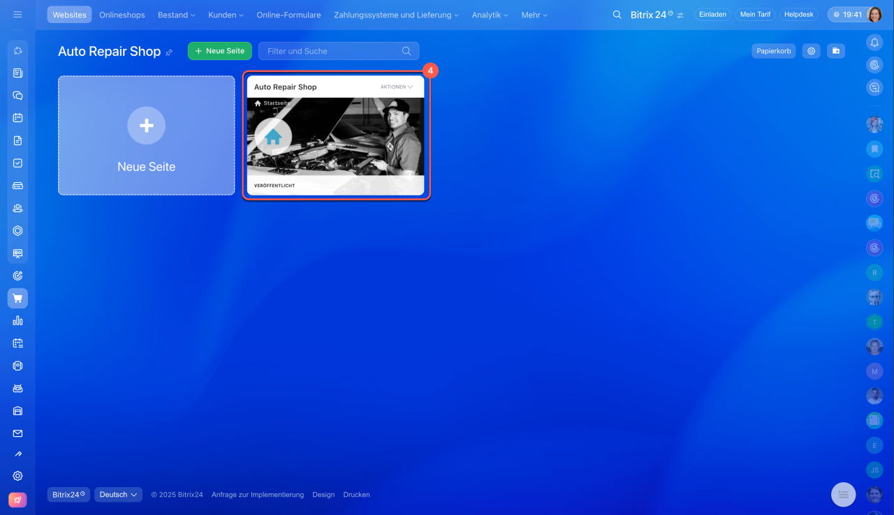 1–2. Öffnen Sie den Bereich Websites und Onlineshops > Websites und wählen Sie die gewünschte Website aus.