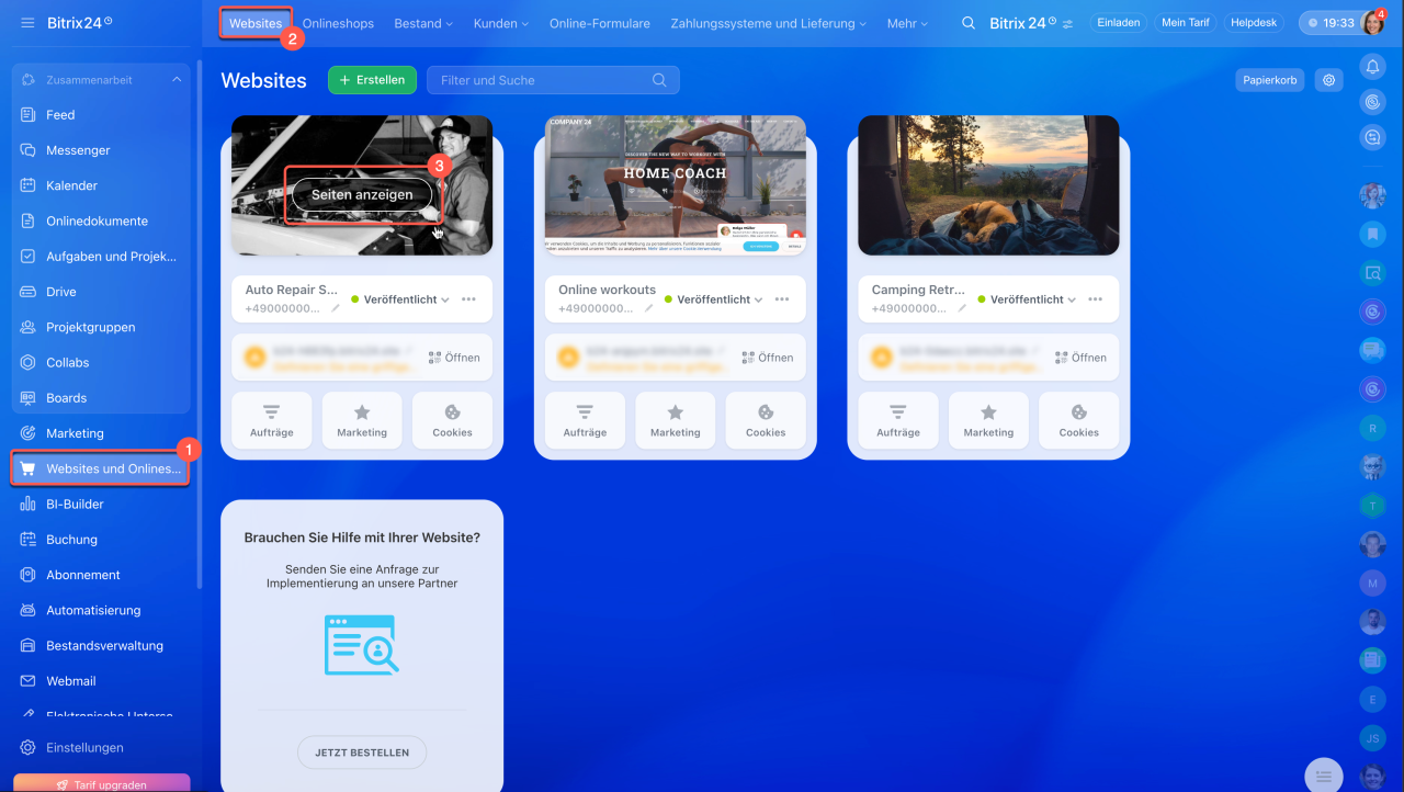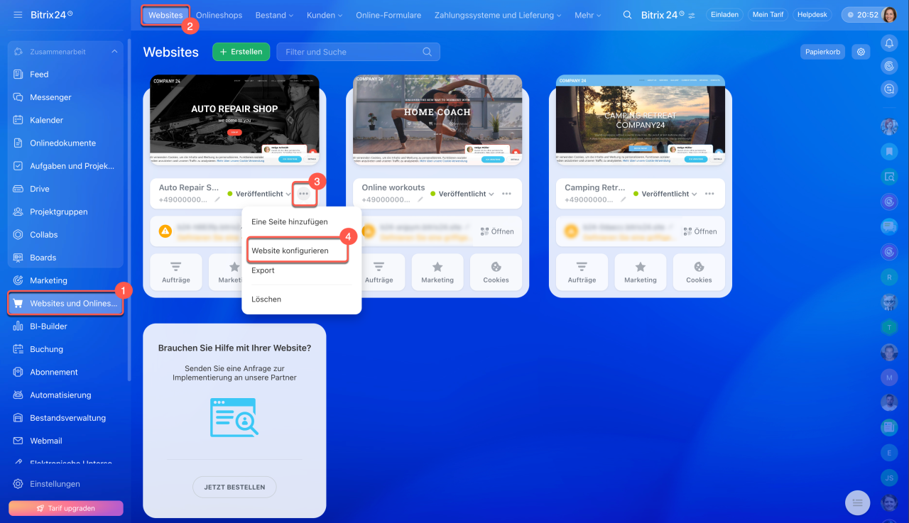 1–2. Öffnen Sie den Bereich Websites und Onlineshops > Websites.