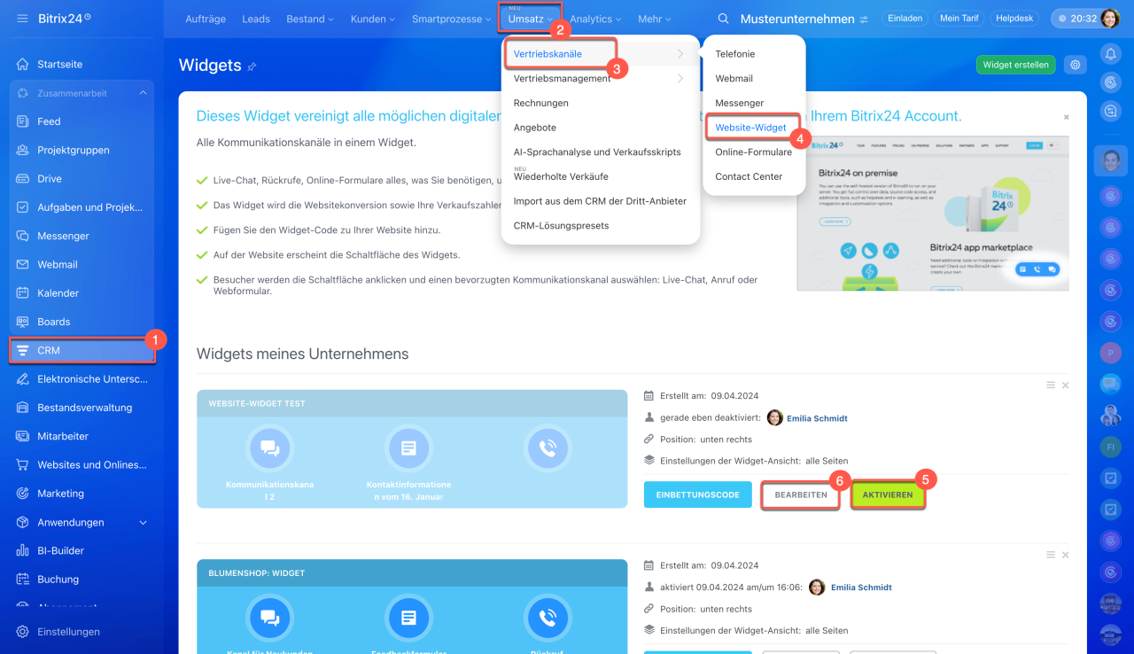 1–4. Öffnen Sie den Bereich CRM > Umsatz > Vertriebskanäle > Website-Widget.