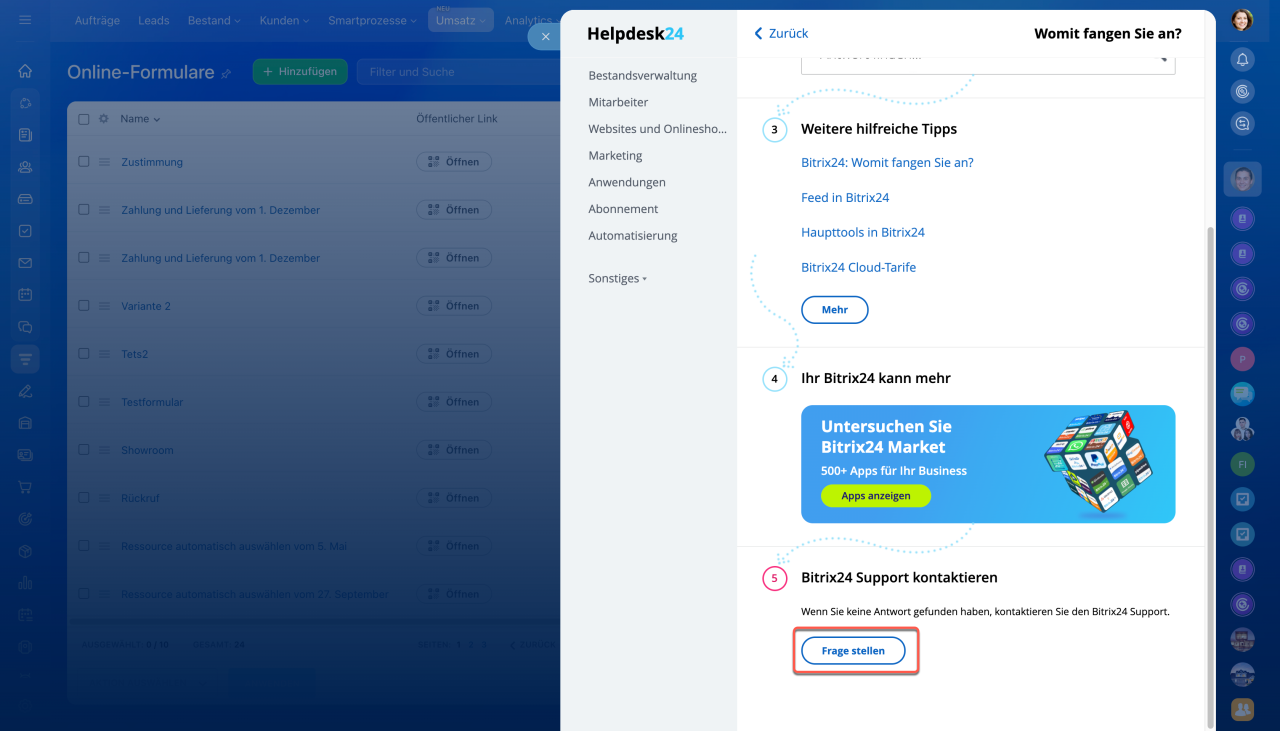Falls Sie Fragen zu bestimmten Methoden haben oder auf technische Probleme stoßen, steht Ihnen der technische Support von Bitrix24 zur Verfügung.