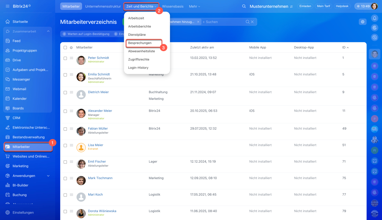 1-3. Öffnen Sie den Bereich Mitarbeiter > Zeit und Berichte > Besprechungen.