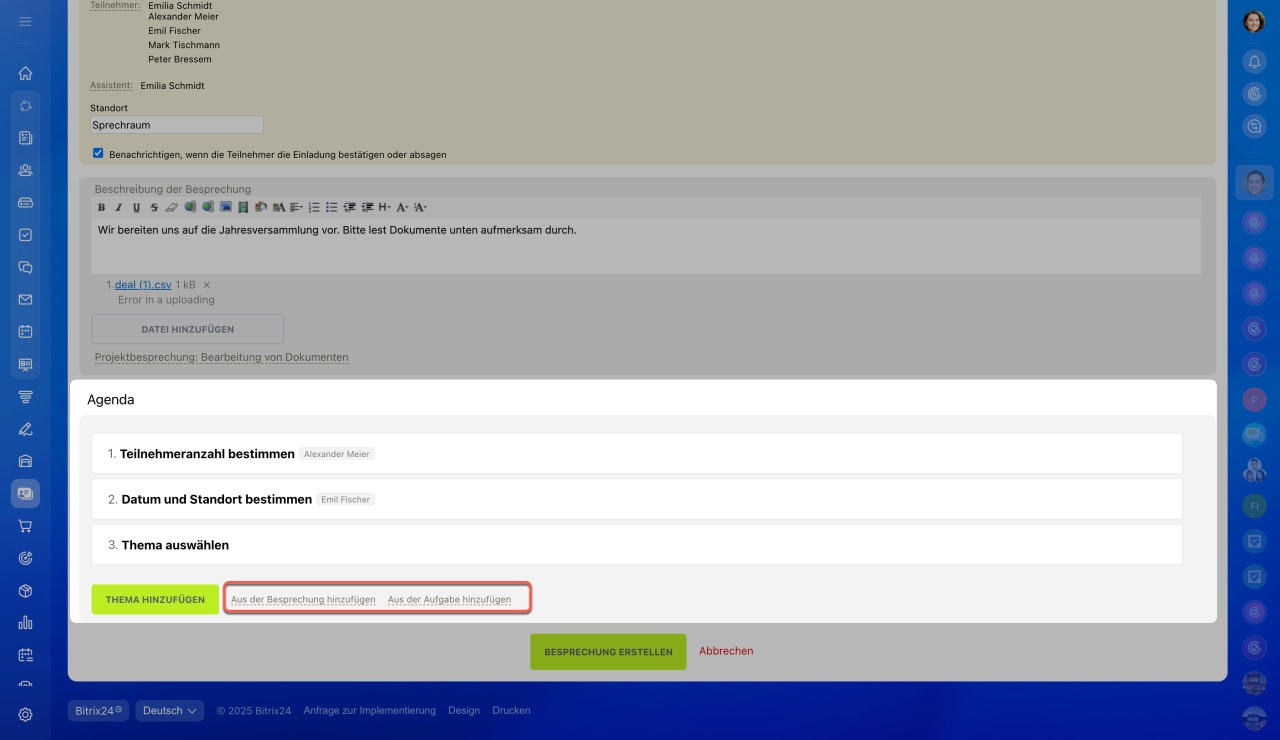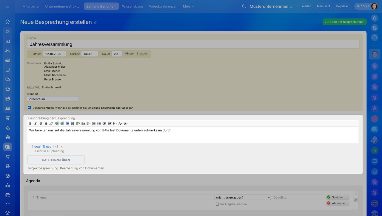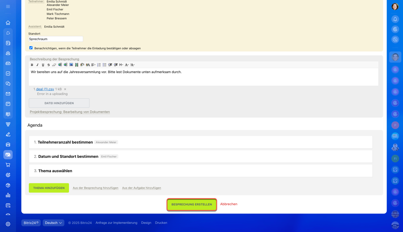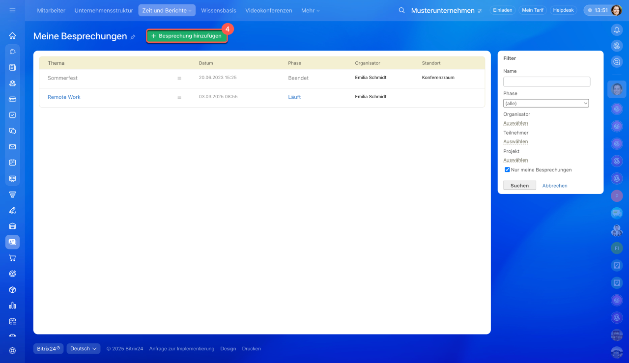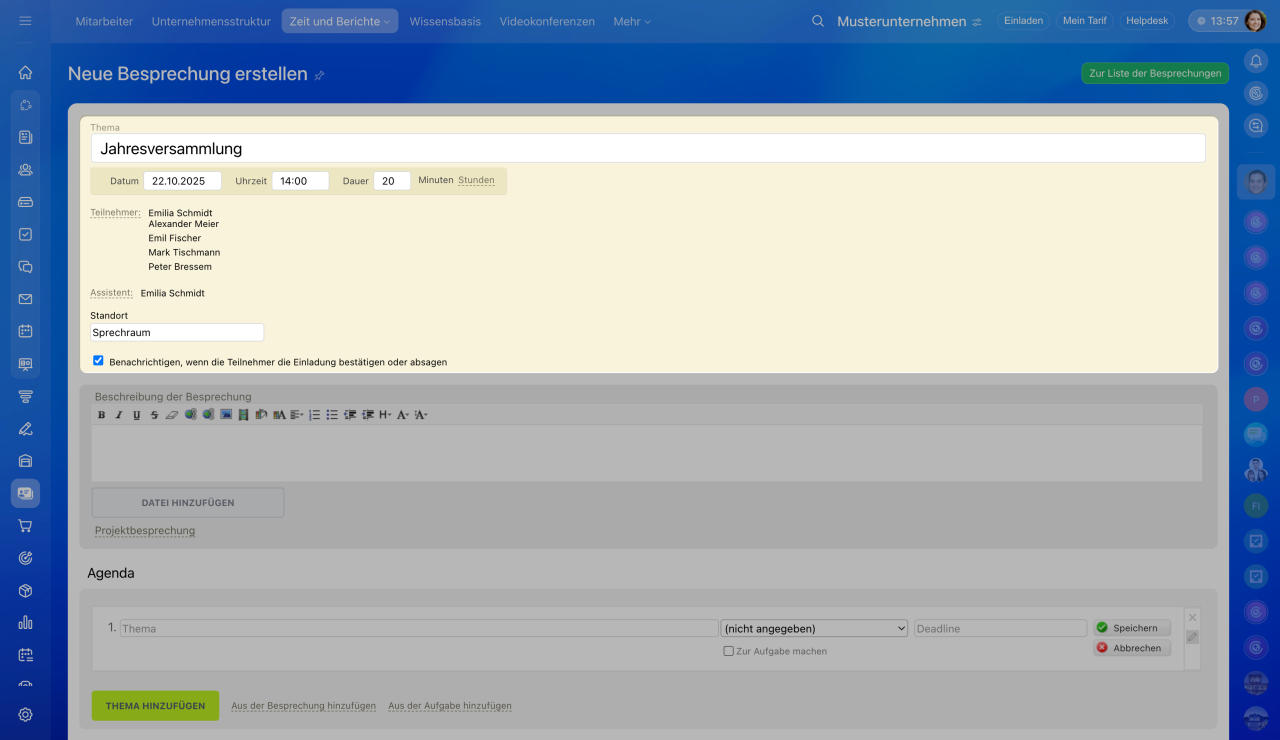 Mit Bitrix24 steht Ihnen ein praktisches Tool zur Verfügung, das Ihnen hilft, Meetings effizient zu planen, durchzuführen und zu protokollieren. Egal, ob Sie ein kleines Teamtreffen oder eine große Projektbesprechung organisieren – Bitrix24 unterstützt Sie dabei, den Überblick zu behalten und wichtige Informationen festzuhalten.