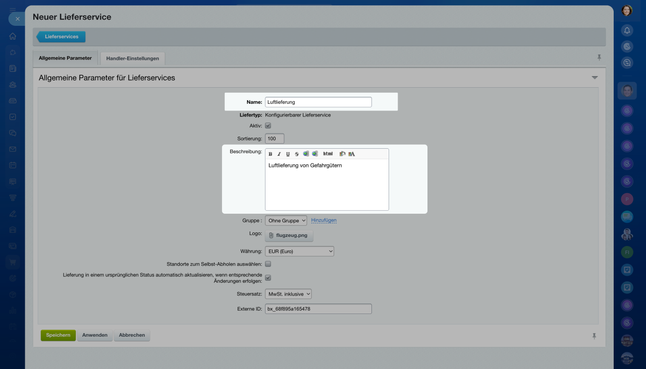 - Geben Sie den Namen und die Beschreibung ein. Fügen Sie bei Bedarf das Logo hinzu. Die Kunden werden diese Information bei der Auswahl von Lieferservices sehen.