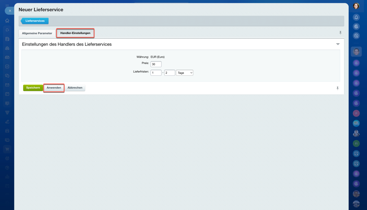 - Im Tab Handler-Einstellungen geben Sie den Preis und Lieferfristen an.