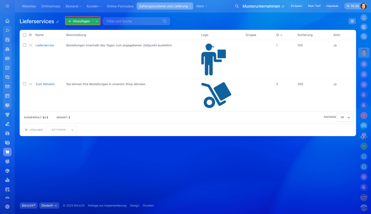 - Um einen neuen Lieferservice hinzuzufügen, öffnen Sie den Bereich Webseiten und Onlineshops > Mehr > Zahlungssysteme und Lieferung > Lieferservices und klicken Sie auf Hinzufügen.