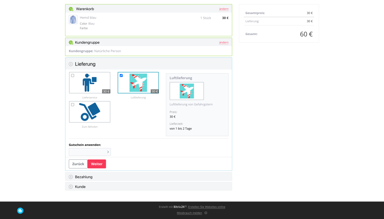 - In Bitrix24 sind bereits 2 standardmäßige Varianten der Warenlieferung verfügbar: Lieferservice und Zum Abholen.