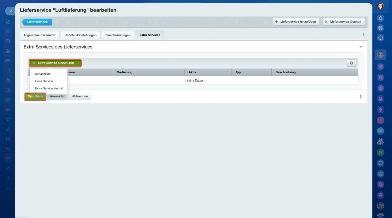 Im Bereich Extra Services können Sie zusätzliche Dienstleistungen einstellen, z. B. Transportversicherung.