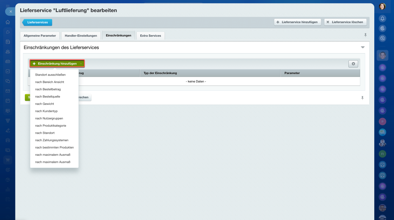 Im Bereich Einschränkungen können Sie Einschänkungen nach verschiedenen Parametern angeben, z. B. nach Gewicht. Damit dieser Lieferservice verfügbar sein wird, vergessen Sie nicht, das Gewicht im Produktformular anzugeben.