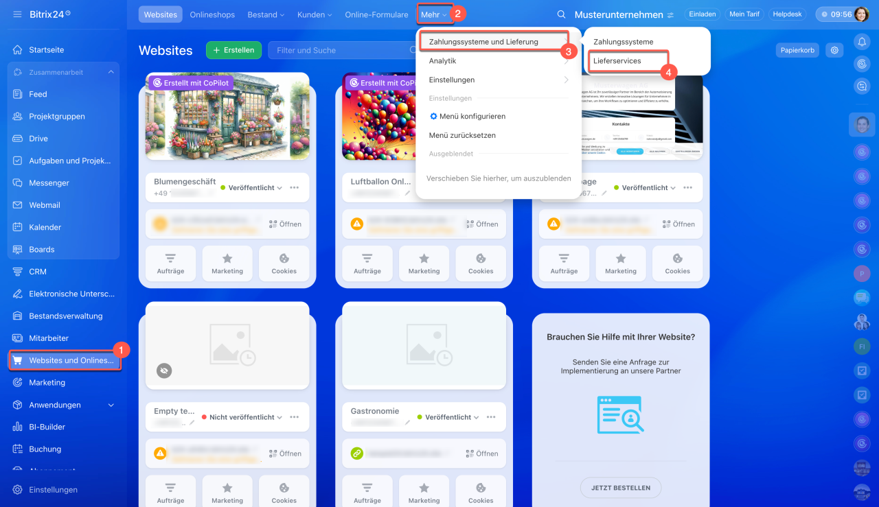 Um Ihre Zahlungssysteme anzuzeigen und zu verwalten, öffnen Sie den Bereich Webseiten und Onlineshops > Mehr > Zahlungssysteme und Lieferung > Lieferservices.