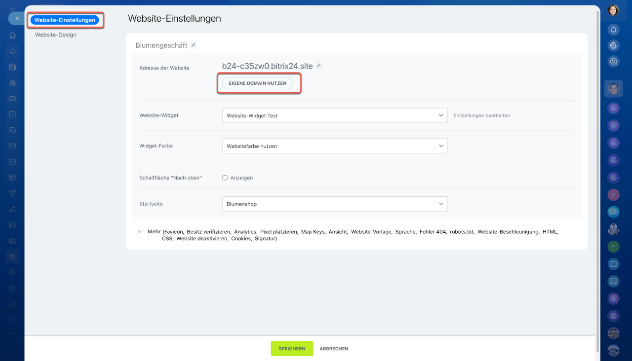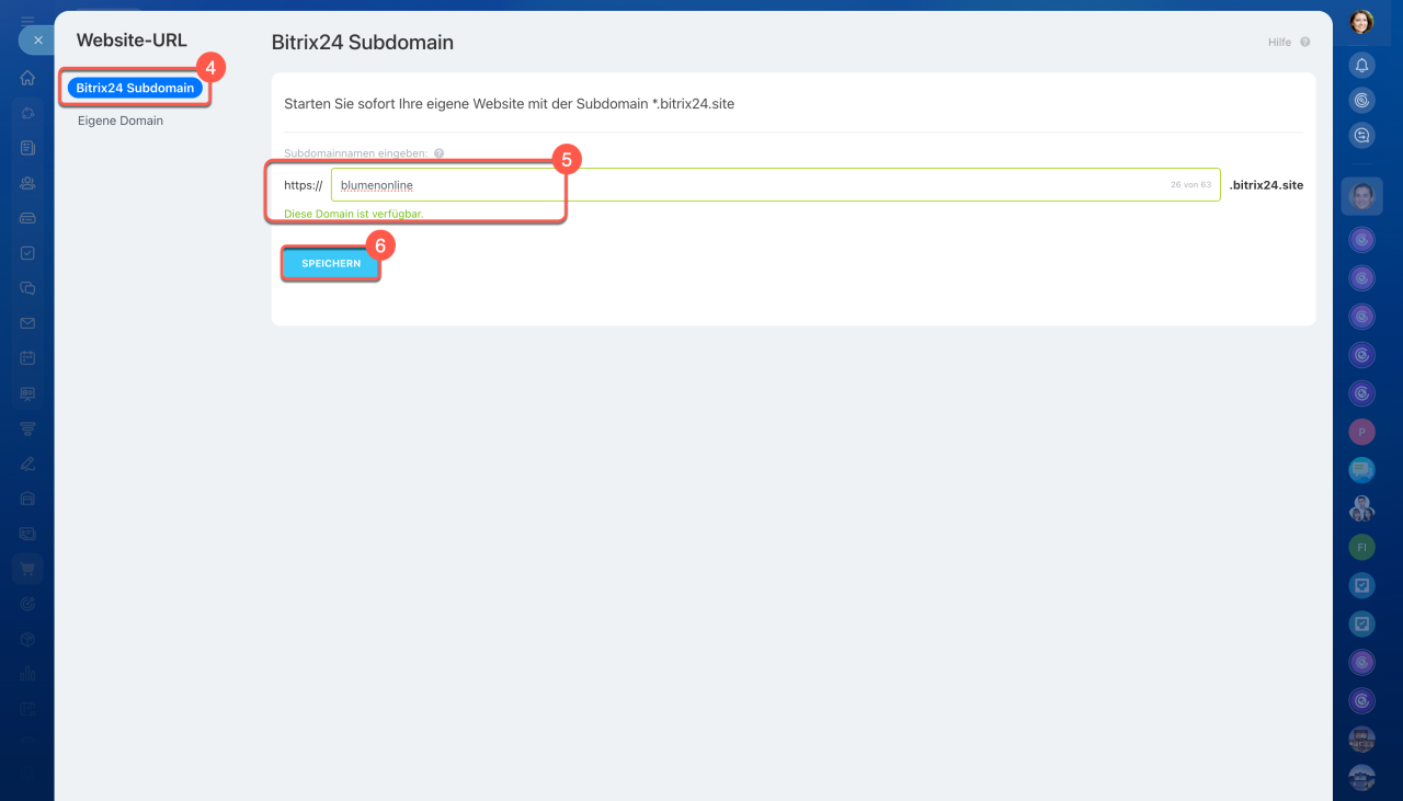 In Bitrix24 können Sie die Verfügbarkeit eines Domainnamens überprüfen und die erforderlichen DNS-Einträge erhalten