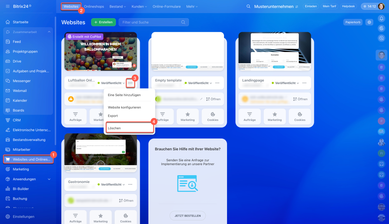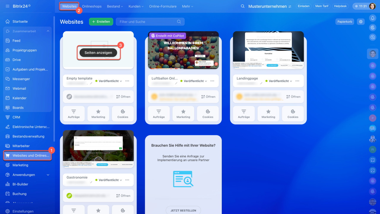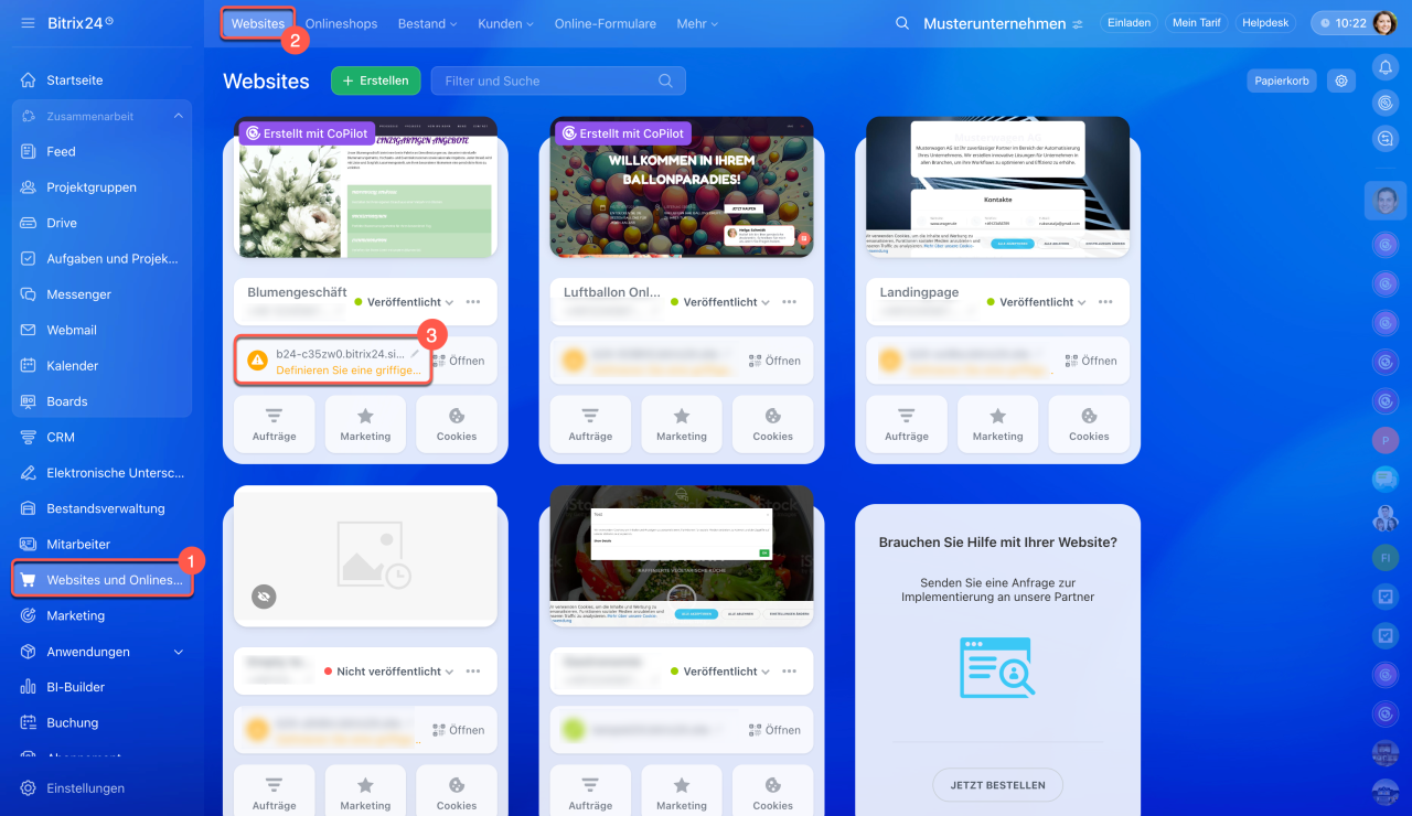 1–2. Öffnen Sie den Bereich Websites und Onlineshops > Websites.