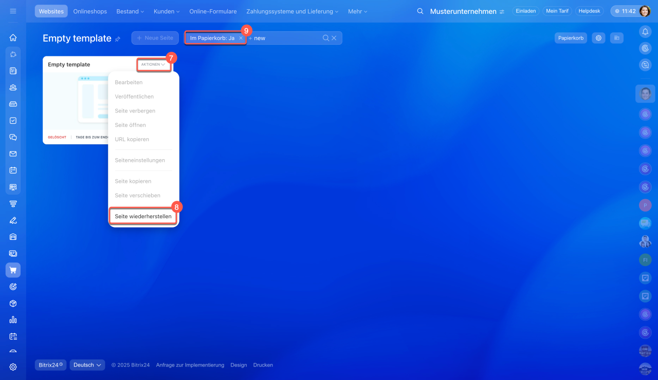 6–7. Finden Sie die wiederhergestellte Seite und klicken Sie auf Aktionen > Seite löschen – sie wird erneut in den Papierkorb verschoben.