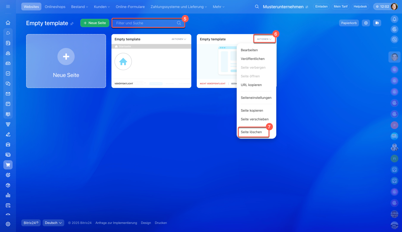 Klicken Sie auf Drei Punkte (...) > Löschen. Die Website wird in den Papierkorb verschoben und dort 30 Tage lang gespeichert. Innerhalb dieses Zeitraums kann sie wiederhergestellt werden, danach wird sie endgültig gelöscht.
