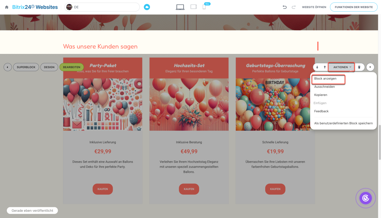 Im Website-Editor können Sie einzelne Blöcke ausblenden oder deren Sichtbarkeit auf verschiedenen Geräten anpassen.