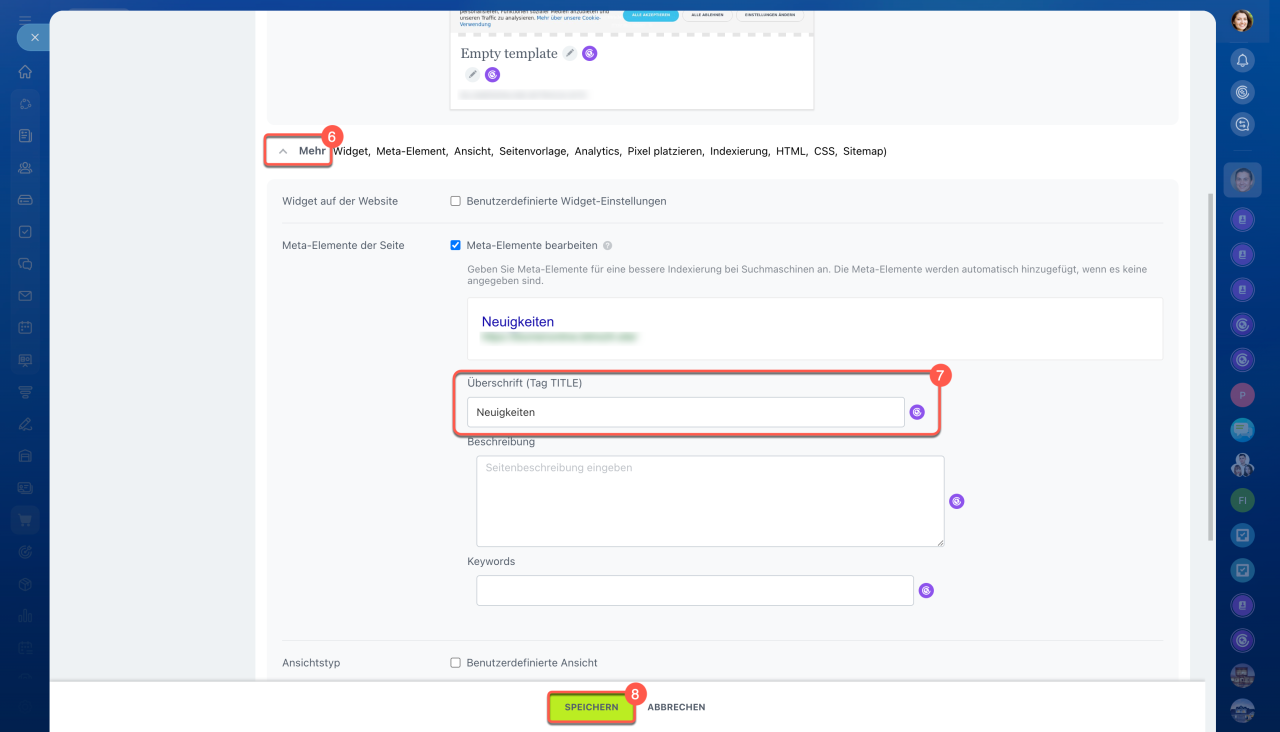 7–8. Geben Sie im Abschnitt Meta-Tags der Seite den gewünschten Titel ein und speichern Sie die Änderungen.
