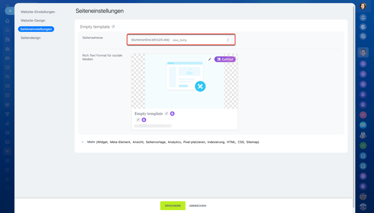 In den Seiteneinstellungen können Sie die Adresse manuell bearbeiten. Manchmal werden jedoch automatisch zusätzliche Zeichen zur eingegebenen URL hinzugefügt. Beispiel: Sie geben /neu/ ein, doch die Adresse wird als /neubshy/ gespeichert.