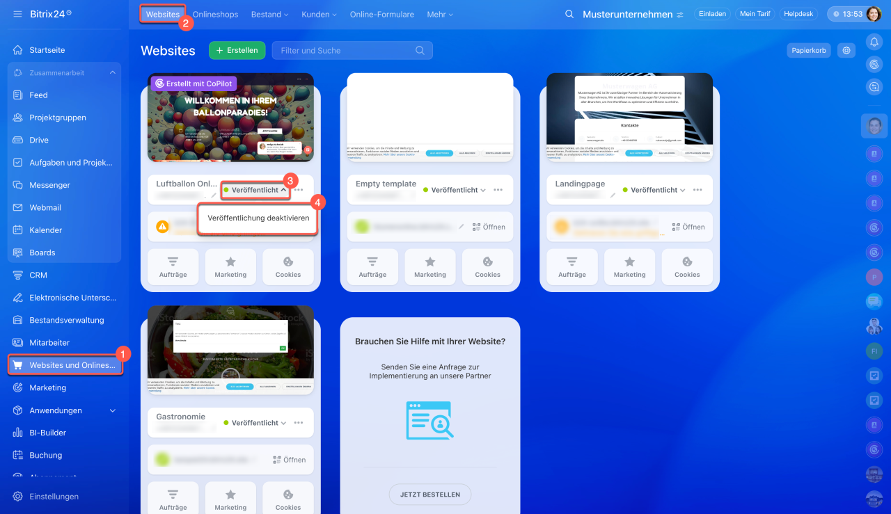 3–4. Klicken Sie auf den Status neben dem Namen der Website und wählen Sie Veröffentlichung deaktivieren aus. Die Website bleibt in Ihrem Bitrix24 erhalten, ist jedoch für Besucher nicht mehr zugänglich. Später können Sie sie erneut veröffentlichen.