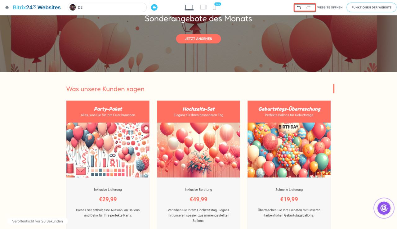 Im Website-Editor können Sie Ihre Aktionen mit den Schaltflächen