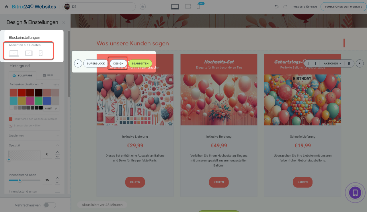 Falls der Block aktiv ist, aber nicht auf allen Geräten angezeigt wird, passen Sie seine Geräte-Sichtbarkeit an. Klicken Sie auf Design und wählen Sie die Geräte aus, auf denen der Block angezeigt werden soll.