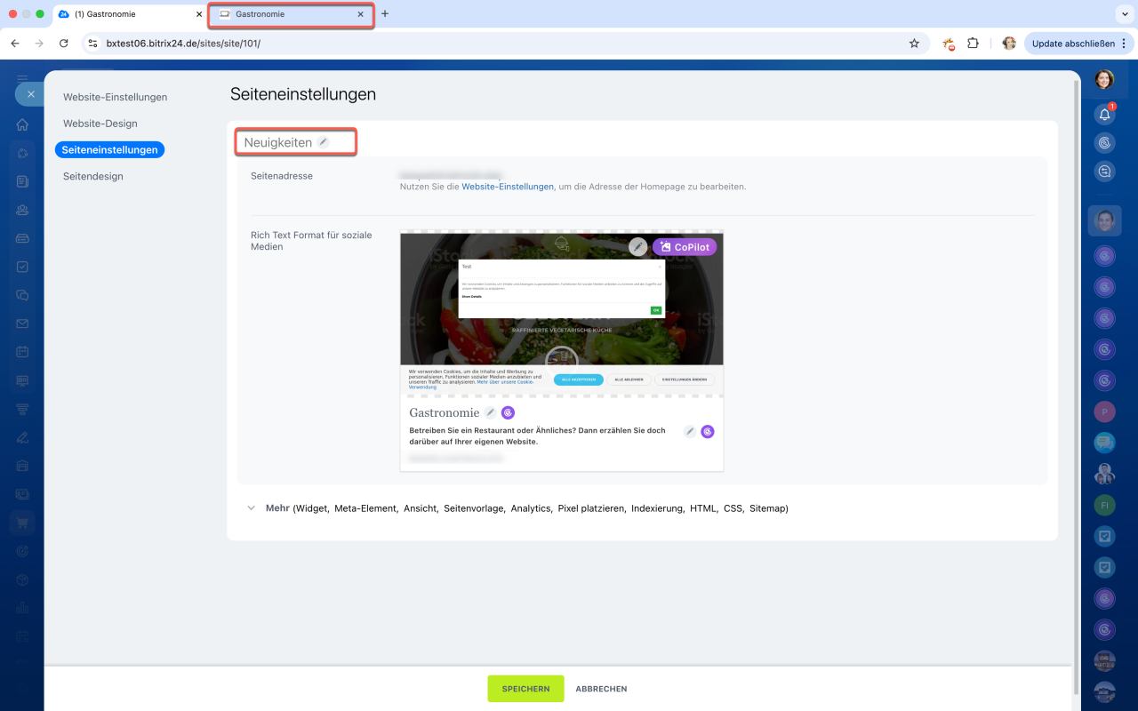 In den Seiteneinstellungen können Sie einen Titel festlegen, der im Browser-Tab angezeigt werden soll. Falls im Browser dennoch ein anderer Titel erscheint, überprüfen und passen Sie die Meta-Tags der Seite an. Diese bestimmen nämlich, welcher Titel den Nutzern tatsächlich angezeigt wird.
